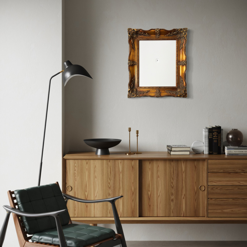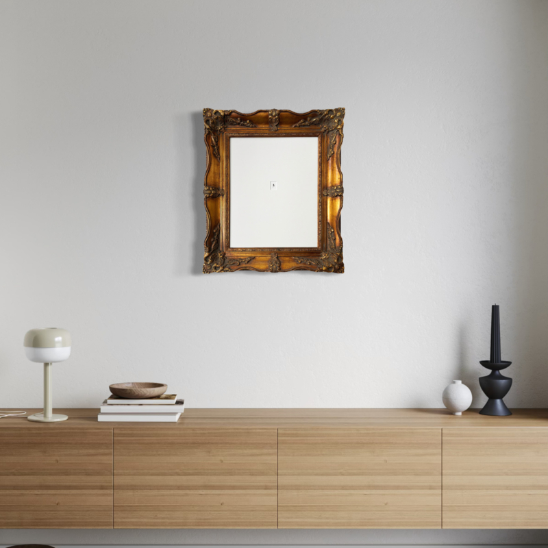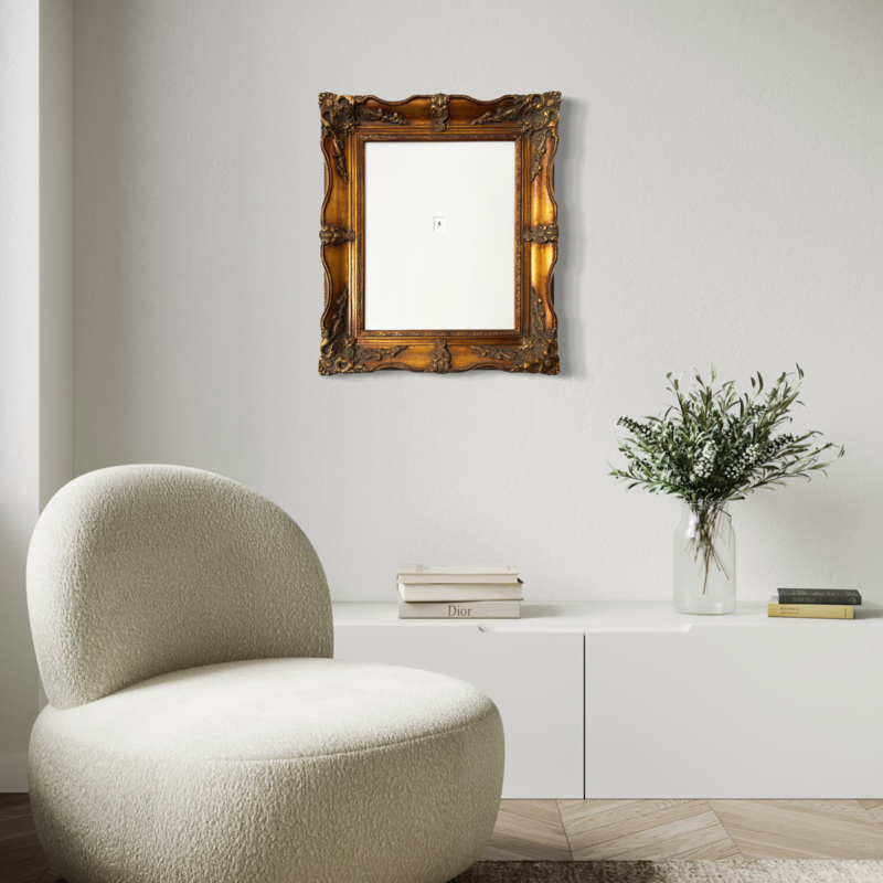 OverzichtPin-up portret van mier in antieke gouden lijst